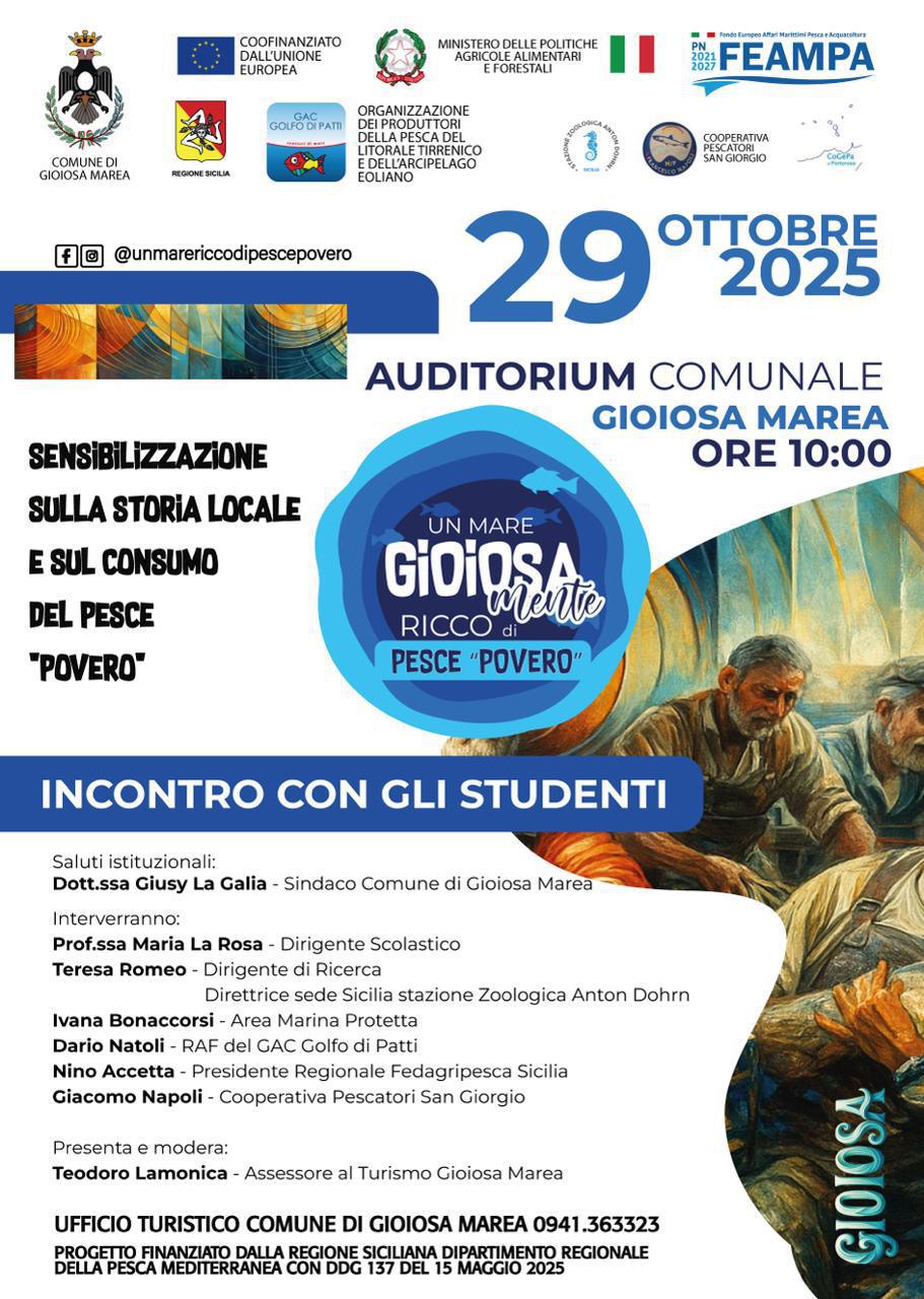 Un progetto finanziato dalla Regione Siciliana – Dipartimento della Pesca Mediterranea, con il supporto dell’Unione Europea (FEAMPA) e del Comune di Gioiosa Marea.
