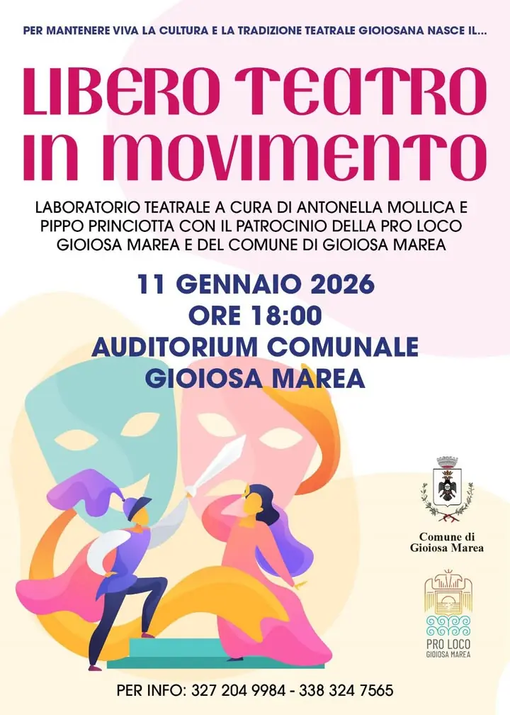 📅 Domenica 11 gennaio 2026 – ore 18:00 📍 Auditorium Comunale – Gioiosa Marea Il teatro è incontro, ascolto, movimento. Nasce “Libero Teatro In Movimento”, uno spazio aperto a chi desidera avvicinarsi al linguaggio teatrale 🎭 e contribuire a custodire e rinnovare una tradizione che appartiene alla no