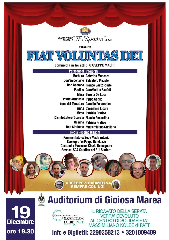 🎄✨ A Natale torna il teatro! ✨🎄 🎭La Compagnia Teatrale “Il Sipario” di Patti presenta la divertente commedia in tre atti “FIAT VOLUNTAS DEI” di Giuseppe Macrì, diretta da Peppino Bisagni. Un appuntamento speciale, ricco di emozioni, risate e tradizione — perfetto per vivere insieme la magia delle fe