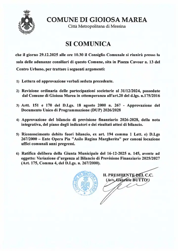 ๐Si riunisce lunedรฌ 29 dicembre 2025 alle ore 10,30 il Consiglio Comunale di Gioiosa Marea convocato dal presidente Gabriele Buttรฒ presso l'aula consiliare del Palazzo Municipale. La cittadinanza รจ invitata a partecipare. Ecco l'ordine del giorno๐